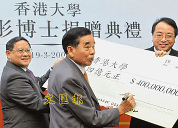 有關(guān)支票捐贈(zèng)儀式19日于港大舉行,除鄭裕彤外,港大校務(wù)委員會(huì)主席馮國經(jīng)、校長(zhǎng)徐立之、法律學(xué)院院長(zhǎng)陳文敏等均有出席。馮國經(jīng)贊揚(yáng)鄭裕彤一直對(duì)教育事業(yè)大力支持,這次捐贈(zèng)也是對(duì)港大每一成員的鼓勵(lì),他對(duì)此深表感激。徐立之則指,鄭裕彤的捐款除支持港大“百周年校園”計(jì)劃外,也有點(diǎn)名支持法律學(xué)院,對(duì)學(xué)院發(fā)展幫助甚大。