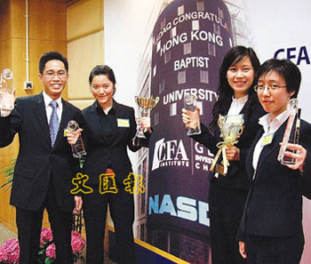 中新網(wǎng)5月13日電 據(jù)香港文匯報(bào)報(bào)道,投資炒股是香港市民生活的一部分,近年更涌現(xiàn)出不少年輕“股神”。香港浸會(huì)大學(xué)工商管理學(xué)院4位本科生通過(guò)7個(gè)月的多輪比賽,打敗全球79隊(duì)參加者,是香港學(xué)生首次奪得在紐約舉行的“全球投資分析比賽”總冠軍。