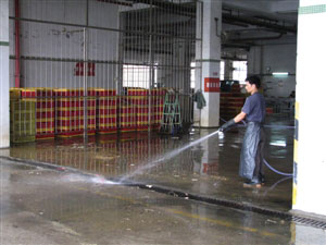 圖:工人清洗批發(fā)市場內(nèi)設(shè)施及使用過的膠籠。(圖片來源:澳門日報)