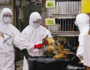 六月十一日,香港食環(huán)署人員穿著保護(hù)袍服到街市圍封活家禽零售點(diǎn)。漁護(hù)署當(dāng)天宣布由于在深水埗等四個街市的雞只樣本,化驗(yàn)出H5N1病毒呈陽性反應(yīng),因此決定于全港街市屠殺活家禽。漁護(hù)署表示,病毒源頭不排除是走私雞。 中新社發(fā) 譚達(dá)明 攝