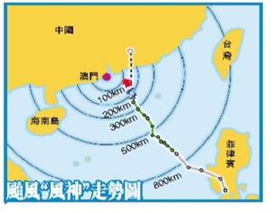 按目前移動路徑,預(yù)期“風(fēng)神”25日清晨時分最接近澳門,在距離澳門東面約100多公里掠過,并于清晨至早上時分在珠江口以東附近登陸。氣象局將密切注視其移動路向及強(qiáng)度變化,不排除改掛更高風(fēng)球。