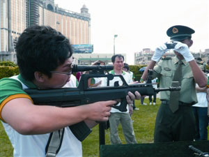 圖:學生手持自動步槍照相。(圖片來源:澳門日報)