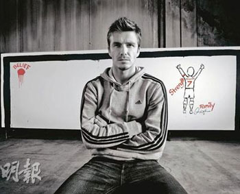 貝克漢姆在某廣告中即席揮毫,畫(huà)了《圓的世界》。(圖片來(lái)源:明報(bào))