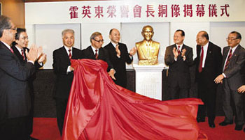 霍老次子、中總會(huì)長霍震寰偕候任會(huì)長蔡冠深、榮譽(yù)會(huì)長曾憲梓等,主持29日銅像揭幕儀式。與霍老相識(shí)多載的曾憲梓,還在霍老銅像面前作三鞠躬,表達(dá)對(duì)他的懷念。