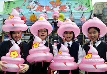 張祝珊英文中學第三度出戰(zhàn)維園年宵,兩班中四商科同學約60人,投資約7萬元售賣1500頂“牛屎帽”。同學們穿上校服、戴上自己的創(chuàng)意產品叫賣,數字同學還齊聲發(fā)出祝福呼聲:“牛氣沖天”,并說“牛屎等如牛市”,在股市疲弱下,這番話令股民特別醒神。
