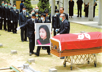 謝婉雯醫(yī)生逝世,下葬浩園(香港安葬因公殉職公務(wù)員之地)。(馬泉崇蘋果日報)因感染SARS而逝世的35歲女醫(yī)生謝婉雯身后被傳媒冠以“香港女兒”的稱號。謝婉雯的父親曾寫下一段話送予港人:“希望婉雯的勇氣和犧牲精神,能夠鼓勵港人永不放棄!