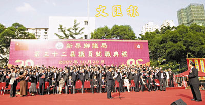 香港新界鄉(xiāng)議局新一屆議員就職典禮昨日(29日)在荃灣舉行,大會(huì)安排了502席盆菜,供來(lái)自全港的鄉(xiāng)紳享用,而出席嘉賓可謂冠蓋云集,有大會(huì)監(jiān)誓人、特首曾蔭權(quán),中聯(lián)辦副主任周俊明,外交部駐港特派員呂新華等以及多名港區(qū)全國(guó)人大代表。