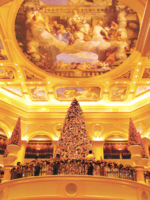 澳門(mén)的議事廳前地那一棵足有兩三層樓高的許愿樹(shù)燈飾會(huì)讓你眼前一亮,一層層藍(lán)盈盈小燈密密?chē),絲毫不會(huì)露出光裸電線(xiàn),底下是制作頗為精細(xì)的大雪人,禮物堆,可愛(ài)得幾乎每個(gè)經(jīng)過(guò)的路人都忍不住要掏出手機(jī)去拍一張,小孩子更不用說(shuō)了,嚷嚷要媽媽放開(kāi)手好讓他爬上去拆禮物,看得人忍不住要會(huì)心微笑。然后郵政局門(mén)口那一棵許愿樹(shù)也十分華麗,而且是很別出心裁地“長(zhǎng)”在了大門(mén)口,叫進(jìn)出的人都覺(jué)得自己是在天使庇佑之下似的,忍不住要在心里許個(gè)小小愿望。即使是在普通的非鬧市區(qū),馬路上也掛上了串串燈飾,顯得氣氛特別濃。至于各大娛樂(lè)場(chǎng)所里面的許愿樹(shù),更是一棵賽一棵的漂亮,一層樓高的是小意思,兩層樓高的是普通規(guī)模,最夸張的是威尼斯人度假村,幾乎每隔一段距離就有一棵或大或小的許愿樹(shù),上面還很細(xì)心地掛滿(mǎn)了蝴蝶結(jié)、許愿球、小禮物、小襪子……看得人又忍不住要掏手機(jī)來(lái)玩自拍,不過(guò)即使一棵一張,估計(jì)即使是512M的卡都會(huì)不夠用呢。