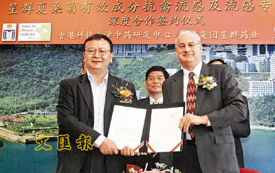 科大將這項(xiàng)專利技術(shù)轉(zhuǎn)讓予國內(nèi)其中一個(gè)最大的中成藥制造基地──廣藥集團(tuán)旗下星群藥業(yè)。雙方二十八日在科大舉行“抗禽流感及流感專利項(xiàng)目深度合作簽約儀式”,加強(qiáng)粵港兩地以中藥防控禽流感及流感的科研合作。