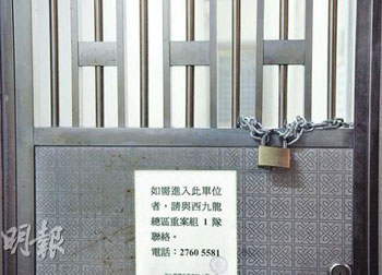 中新網(wǎng)5月12日電 據(jù)香港明報(bào)報(bào)道,香港16歲少女王嘉梅遭肢解兇案中,相信是案發(fā)第一現(xiàn)場(chǎng)的石硤尾街39號(hào)仁發(fā)大廈2C套房已沒(méi)有警員把守,但大門(mén)由粗鐵鏈鎖上,并貼有告示聲明進(jìn)入單位者需與重案組探員聯(lián)絡(luò)。被告丁啟泰由警方看管至本周四再度提堂。