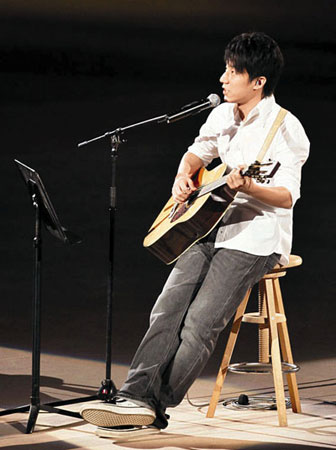 圖:房祖名自彈自唱送給四川災區(qū)人民。(圖片來源:文匯報)
