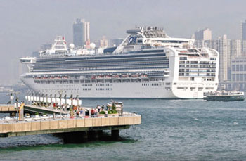 排水量超過(guò)11萬(wàn)噸的鉆石公主號(hào)郵輪,14日載著逾3000名船員及旅客抵港。由于船只體積太大,不能靠近海運(yùn)碼頭,只能在西環(huán)對(duì)外海面停泊,旅客要乘接駁船只,乘船到中環(huán)港外線碼頭上岸。旅發(fā)局特別派出職員在碼頭接待,在碼頭設(shè)置咨詢及服務(wù)專柜,向旅客派發(fā)歡迎禮包。