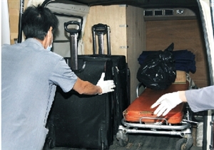 仵工將裝有碎尸殘軀的膠袋及旅行箱搬離現(xiàn)場。(圖片來源:澳門日報)
