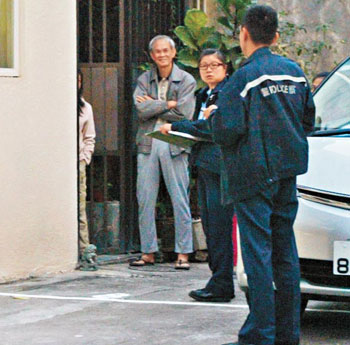 男戶主陳通美(左)走出單位協(xié)助調查。(圖片來源:蘋果日報)