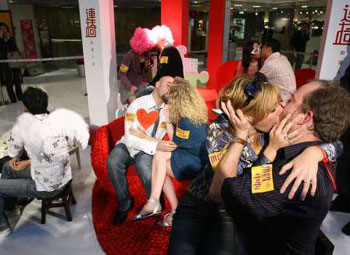 在鎂光燈的閃爍下,五對(duì)來(lái)自不同國(guó)家的情侶,坐上獨(dú)特的“愛(ài)情連椅”,他們要在眾目睽睽下,用各異的方式吻自己的愛(ài)侶,持續(xù)2分14秒。圍觀(guān)市民大感興趣,摒住呼吸觀(guān)賞現(xiàn)場(chǎng)的熱吻。