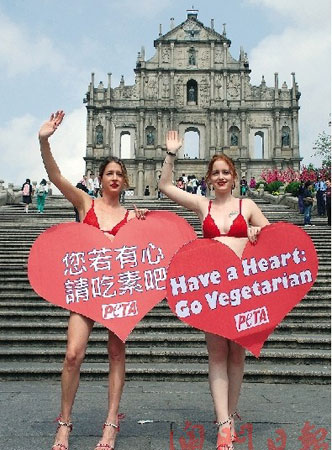 兩名性感內(nèi)衣女郎12日中午12時(shí)現(xiàn)身旅游旺區(qū)——大三巴牌坊,兩人手持心形的“您若有心,請(qǐng)吃素吧”標(biāo)語。兩人是善待動(dòng)物組織成員,來到澳門主要傳遞“素食對(duì)身心均有益處”和“吃素是對(duì)我們自己、動(dòng)物及地球最好的情人節(jié)禮物”等訊息。