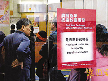 中新網(wǎng)1月14日電 據(jù)香港《文匯報(bào)》報(bào)道,春節(jié)將至,香港市民又要為換新鈔“封利是”張羅。每年春節(jié)前夕,相關(guān)單位都會(huì)加印鈔票供市民使用,香港銀行14日起為客戶提供新鈔兌換服務(wù),有新印及回收的新簇舊鈔兩款以供選擇,各面額鈔票的供應(yīng)量會(huì)與去年相若,料有3至4億張不同面值的新鈔供應(yīng)。