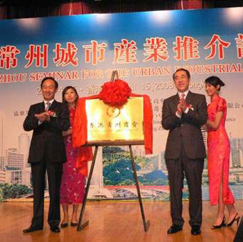 圖:唐英年(右)與常州市委書記范燕青(左)為香港常州商會(huì)的“金漆招牌”進(jìn)行揭幕儀式。(圖片來源:大公報(bào))