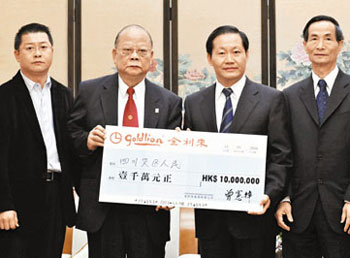 恒基兆業(yè)集團(tuán)主席李兆基亦于14日委托次子李家誠送交由恒基兆業(yè)地產(chǎn)有限公司和中華煤氣公司捐贈的1000萬元賑災(zāi)支票。