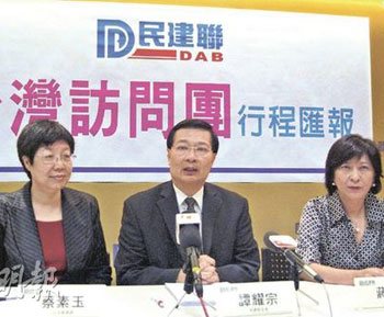 香港民建聯(lián)主席譚耀宗(中)總結訪臺行程。左為蔡素玉,右為蔣麗蕓。(圖片來源:明報)