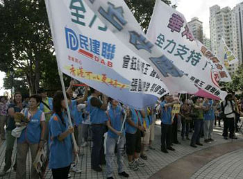 資料圖:九月香港立法會(huì)選舉七月十九日開始接受提名,選舉事務(wù)處總共接獲三十八份提名表格。圖為民建聯(lián)在長沙灣區(qū)舉行宣傳儀式,民建聯(lián)全部二十九位參選人聯(lián)同二百人助選團(tuán)出席報(bào)名儀式,為大家打氣加油。 中新社發(fā) 張勤 攝