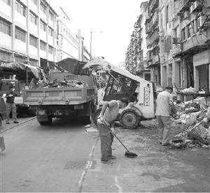 清潔工人利用大型機(jī)械及車(chē)輛移走垃圾。(圖片來(lái)源:澳門(mén)日?qǐng)?bào))