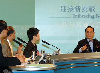 曾蔭權(quán)重申,特區(qū)政府堅(jiān)持“大市場(chǎng)、小政府”的原則,但金融市場(chǎng)有需要時(shí),特區(qū)政府必定采取快而準(zhǔn)、到位及夠力度的行動(dòng),但沒有需要時(shí),特區(qū)政府必定退出。