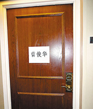 曾俊華在華盛頓獲安排隨國家代表團(tuán)其它成員入住萬豪Wardman Park酒店9樓,與國務(wù)院副總理王岐山、人民銀行行長周小川,其它參與會(huì)議的部長及中國駐美大使周文重夫婦等同一樓層。為了方便各成員易于識(shí)別房間的住客,門外都貼上團(tuán)員名字。