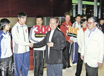 中新網(wǎng)2月9日電 據(jù)香港《明報(bào)》報(bào)道,香港東亞運(yùn)動會8日進(jìn)入倒數(shù)300日,特首曾蔭權(quán)和太太8日晚在港協(xié)暨奧委會會長霍震霆陪同下,特地到紅磡體育館觀看為東亞運(yùn)動員籌款的“左麟右李”演唱會,并與多名香港運(yùn)動員,包括羽毛球好手葉姵延握手。