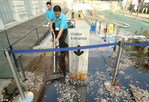 抗議者選擇泰德美術(shù)館開夏日聚會的時(shí)候,來到美術(shù)館門口表達(dá)自己的不滿,呼吁美術(shù)館盡快停止接受贊助。一些人手持印有BP字樣的原油桶,往美術(shù)館入口處的空地上潑灑石油和羽毛。頓時(shí)美術(shù)館門口滿眼狼籍,吸引了很多的過路人。