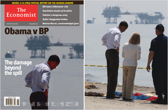 《經(jīng)濟(jì)學(xué)人》的這張封面照讓美國民眾極為憤怒。原來,這張圖片被編輯做了刻意的修改,利用Photoshop去掉了兩個(gè)人——站在奧巴馬右側(cè)的拉福什縣縣長夏洛特·蘭道夫(Charlotte Randolph)(中)和美國海岸警衛(wèi)隊(duì)司令薩德·艾倫(Thad Allen)。而這樣做的目的就是營造出“孤獨(dú)”的氣氛。