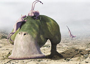 在霍金的宇宙中,火星、月球等類地行星上生活著兩只腳的食草動(dòng)物。它們能利用吸塵器般的巨型嘴巴從巖石的縫隙中吸食食物。類地行星上還存在類似蜥蜴的食肉動(dòng)物,雙方偶爾爆發(fā)獵食大戰(zhàn)。