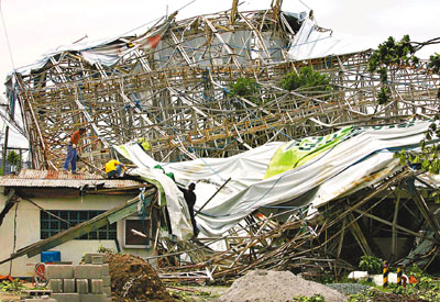 菲律賓群島位于西太平洋,平均每年遭受臺(tái)風(fēng)和熱帶風(fēng)暴襲擊20多次,去年風(fēng)災(zāi)造成43.8億美元經(jīng)濟(jì)損失。2009年9月底和10月,熱帶風(fēng)暴凱薩娜和臺(tái)風(fēng)芭瑪相繼吹襲菲律賓,引發(fā)嚴(yán)重洪災(zāi)和山體滑坡,造成約1000人死亡。