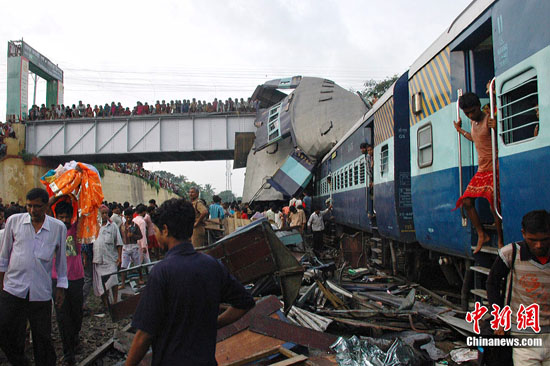 兩個(gè)月前,一列由東部西孟加拉國(guó)邦首府西加爾各答開往西部大城市孟買的快速客運(yùn)火車,駛至加爾各答以西約150公里的一條小鎮(zhèn)時(shí),13節(jié)車廂突然出軌,一列貨運(yùn)火車迎面駛至,把客車其中4節(jié)車廂撞至嚴(yán)重變形扭曲,造成145人死亡。