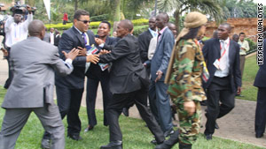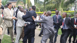 峰會第一天,利比亞總統(tǒng)衛(wèi)隊即與烏干達安全人員發(fā)生了拳腳沖突。根據(jù)CNN記者薩曼森納塔爾的描述,當(dāng)時正要舉行峰會開幕式。按照規(guī)定,只有國家首腦被允許進入會場。利比亞總統(tǒng)衛(wèi)隊試圖護送卡扎菲通過入口,遂與烏干達安全人員發(fā)生爭論,隨后升級為肢體沖突,但是雙方?jīng)]有動槍。