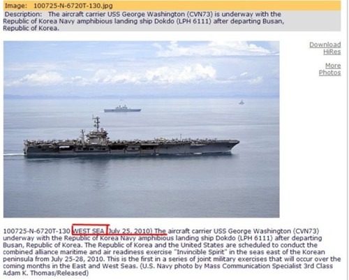 記者于7月28日再次登錄美國海軍官方網(wǎng)站,發(fā)現(xiàn)之前被標(biāo)為拍攝于“西!(中國稱“黃!)并在7月27日被刪除的照片,已經(jīng)再度被上傳到網(wǎng)站上,而其標(biāo)注的地點(diǎn)已經(jīng)被更正為“日本海”。