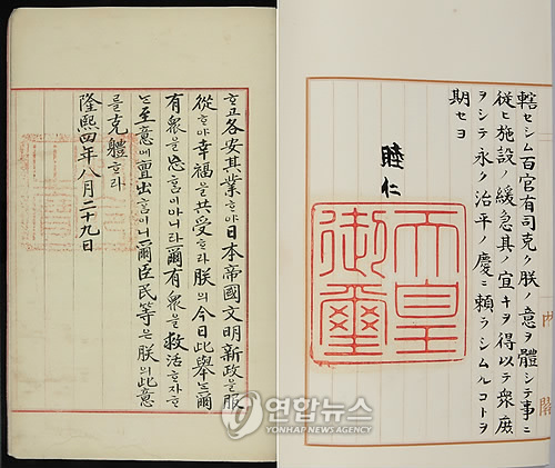 韓日合并當(dāng)時(shí)第三任朝鮮統(tǒng)監(jiān)寺內(nèi)正毅于1910年8月22日全權(quán)委任大韓帝國總理大臣李完用勸說純宗皇帝在條約上簽名,純宗皇帝被逼無奈,印上國璽(大韓國璽),并在上方署名。但條約若要生效,須公布兩國皇帝的詔書。純宗在條約上署名后,寺內(nèi)正毅與李完用簽署有關(guān)雙方各自準(zhǔn)備詔書的協(xié)議。再之后的8月29日,韓日兩國頒布了詔書。