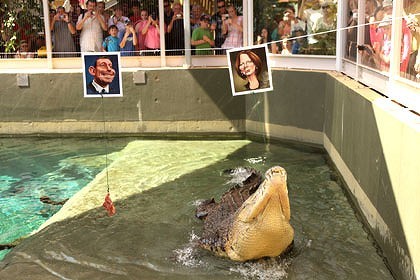 中新網(wǎng)8月20日電 據(jù)外電報(bào)道,澳大利亞一家動(dòng)物園18日讓鱷魚對(duì)將于21日舉行的大選做出預(yù)測(cè),結(jié)果現(xiàn)任澳大利亞總理吉拉德被鱷魚看好將在選舉中勝出。