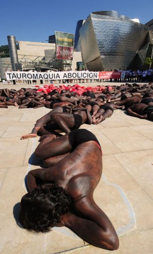 周末的抗議活動由國際動物保護(hù)團(tuán)體策劃,抗議者在身上涂上紅色顏料,象征鮮血,倒臥地上排成牛只的圖形,并大聲疾呼,效法加泰羅尼亞地區(qū)禁止斗牛。