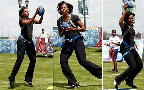 現(xiàn)在,這位備受關注的第一夫人又以身作則,她加入到由印第安納波利斯小馬隊教練托尼·唐奇、前坦帕灣海盜隊線衛(wèi)德里克·布魯克斯等橄欖球明星發(fā)起的旨在倡導青少年健康生活的美式橄欖球運動,在學生們面前大展她運動的天賦。