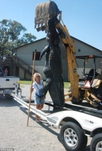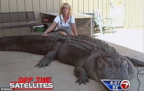 在南卡羅來(lái)納州摩爾特里湖中,48歲的瑪拉·克里斯蒂安與這條巨大無(wú)比的可怕生物爭(zhēng)斗了兩個(gè)小時(shí)。22毫米口徑的獵槍根本無(wú)法制服它,瑪拉就用鋒利的尖刀切斷了野獸的脊柱。最終,她終于可以在起吊機(jī)前細(xì)細(xì)打量這條令人難以置信的鱷魚。