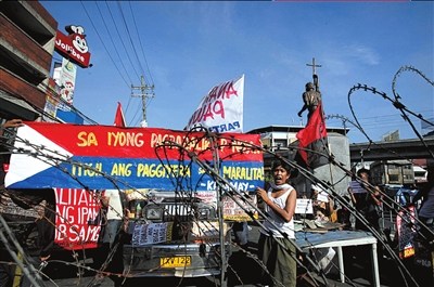 28日,遭強(qiáng)制拆遷的菲律賓民眾在菲總統(tǒng)府外倒掛國旗,集會(huì)抗議政府強(qiáng)制拆遷首都馬尼拉的貧民窟。