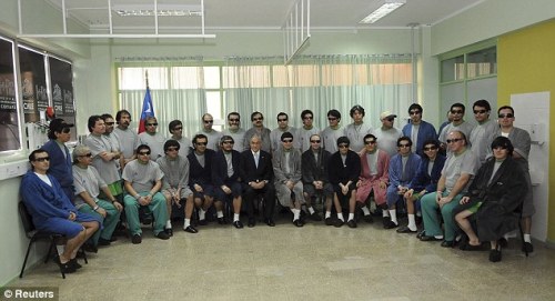 中新網(wǎng)10月15日電 據(jù)外電報(bào)道,戴著護(hù)視鏡,身著醫(yī)用長(zhǎng)袍,33名智利礦工獲救后在醫(yī)院團(tuán)聚,拍下了他們重見(jiàn)天日后的首張集體照。