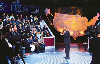 奧巴馬現(xiàn)身由“黑人娛樂電視”(BET)、“鄉(xiāng)村音樂電視”(CMT)和MTV電視臺主辦的直播節(jié)目,和年青人面對面談就業(yè)、移民和同性戀等問題。這些電視臺的主要收視群都是80、90后年青人。