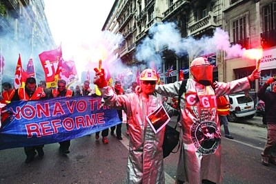 為削減財政赤字、避免陷入主權(quán)債務(wù)危機,法國與其他歐洲國家一樣,推出系列財政緊縮政策,包括定于20日在參議院投票表決的退休制度改革法案。法案把最低退休年齡和可領(lǐng)取全額養(yǎng)老金的退休年齡提高2年,一經(jīng)公布便引發(fā)大規(guī)模罷工抗議。