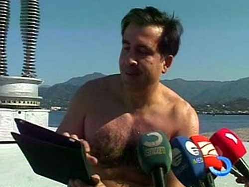 俄媒體報道認(rèn)為,薩卡什維利“赤膊”接受記者采訪“明顯是效仿普京進(jìn)行的炒作”。此前,普京還是俄總統(tǒng)時在西伯利亞赤膊打魚的照片曾引起關(guān)注,隨后奧巴馬同樣的“赤膊照”也震驚了世界。