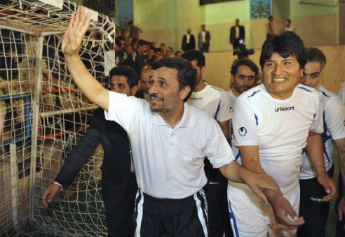 中新網(wǎng)10月29日電 據(jù)外電報(bào)道,伊朗總統(tǒng)穆罕默德·內(nèi)賈德和玻利維亞總統(tǒng)莫拉萊斯長(zhǎng)久以來因相似的政治立場(chǎng)和對(duì)美國(guó)的尖銳批評(píng)而為世界所矚目,F(xiàn)在,他們又站在同一陣營(yíng)中,不過這一次是在五人制足球場(chǎng)上。