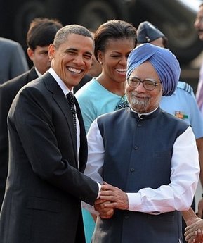 7日,奧巴馬抵達(dá)印度首都新德里,晚上在總理官邸與印度總理辛格進(jìn)行了私人晚宴。