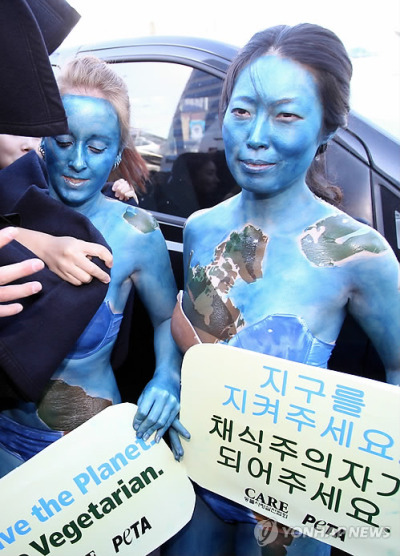 據(jù)稱,9日下午,“從倫理的角度對待動物的團(tuán)體”成員加拿大人F某(24歲、女)和“愛護(hù)動物實踐協(xié)會”成員韓某(34歲、女)幾乎赤裸著身體在COEX附近舉行游行示威,呼吁人們只吃素食,不要吃肉。