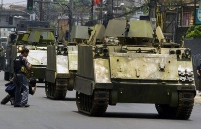 最少10輛配備點(diǎn)50口徑機(jī)關(guān)槍的“M113”裝甲車,隆隆駛過里約熱內(nèi)盧市中心街頭,長驅(qū)直進(jìn)開往該市北面的克魯賽羅貧民窟。當(dāng)局從來未試過出動(dòng)這種重裝備對付毒販,今次十足打仗一樣,許多居民都嚇了一跳。